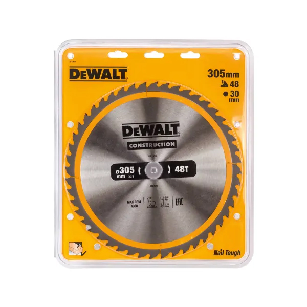 This DEWALT Construction Circular Saw Blade has been designed for cutting rough timber, possibly with embedded nails.