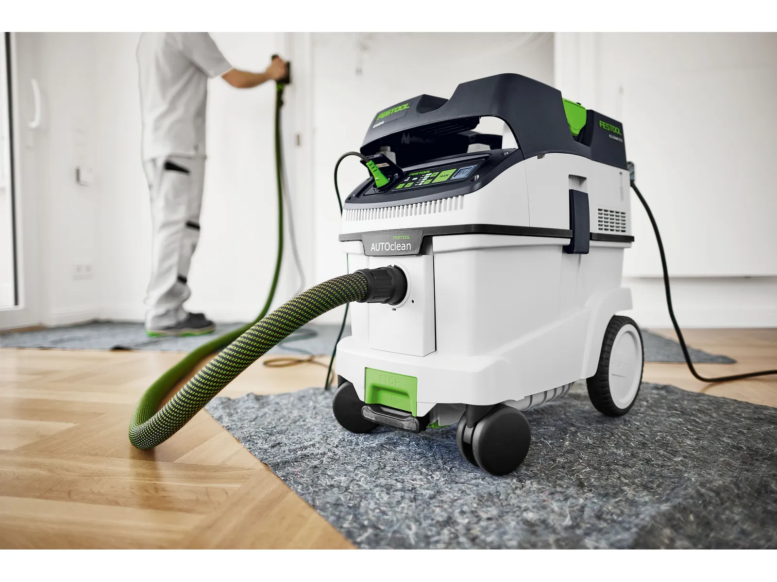 Compared with its predecessor, the CLEANTEC CTM 36 EI AC boasts more effective AUTOCLEAN main filter cleaning. This ensures a consistently high suction power, longer working intervals and a longer filter service life with lower maintenance effort. It comes with touch operation for intuitively controlling your extractor. It has a permanently installed Bluetooth® interface for starting the extractor using a Festool cordless tool or automatically starting it with optional remote control. Your extractor is also connected to the Festool app, which is where you can set cleaning intervals, for example. The smooth, anti-static suction hose can be handily stowed away in the integrated hose holder.