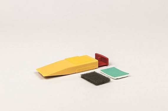 The tool includes a cleaning comb to remove filler from grooves which in turn houses the coarse sanding pad and fine polishing cloth.