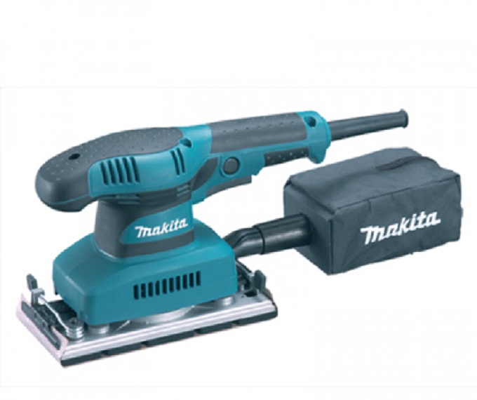 Makita BO3710 1/3″ Sheet Orbital Sander, complete with punch plate and dust bag. Available in 110 and 240 volts. It has Rubberised soft grip and ergonomic design, Increased motor power, Improved paper fixing, It accepts all 1/3rd sheet sanding papers which are secured to the machine by the clamps at either end of the base which has 8 holes to suck the dust into the dust bag and is supplied as standard. The Makita BO3710 features an ergonomic handle design for operator comfort and control, a large clamping lever for quick and easy changing of sanding paper, large trigger switch for smooth and easy operation, effective dust collector system for clean operation. This Makita 1/3 sheet orbital sander is quite an easy machine to use thanks to the rubber grips on the handle and top of the machine which also help to reduce vibration.