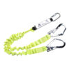 This double ended elasticated lanyard features a shock absorber, two scaffold hooks, a carabiner and is made from elasticated polyester webbing. It is 180cm long including connectors when fully extended.