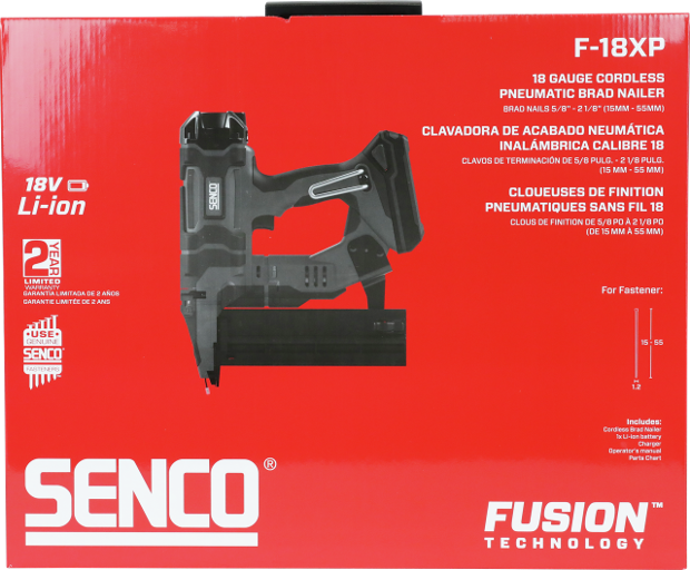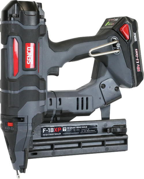 SENCO’S F-18XP brad nailer, with Fusion Technology, has the power and utility of a pneumatic tool, combined with the convenience of a cordless tool. The nailer drives 1,2 (AX) brad nails, ranging in length from 15mm to 55mm. Thanks to its patented design that provides an instant shot when the trigger is pulled, there is no rampup time. Perfect for trim crews, remodelers, punchout, or anyone who doesn’t want to deal with the hassle of a hose and compressor.