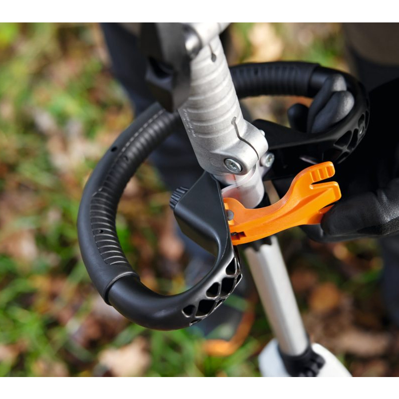 Fitted with a new style loop handle that has a quick-mounting system, meaning you can adjust the handle to your height for an ergonomic working position. This handle also makes tackling tasks on slopes, around trees or on uneven terrains even easier. The KMA 80 R has a powerful brushless EC motor and speed-adjustment on the control handle, which can be set at 2 different speed settings. There is an ECO mode (level 1), for KombiTools suited to simple tasks such as trimming lawn edges, which results in lower energy consumption for extended battery life. And there is full speed mode (level 2), for KombiTools suited to tasks that need more power, such as clearing leaves which requires extra battery energy. However, depending on the KombiTool attached, the speed adjustment can also be infinitely variable.