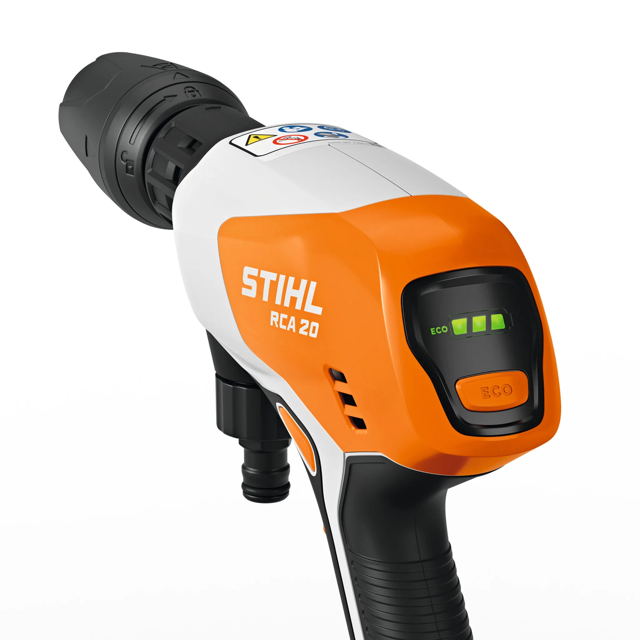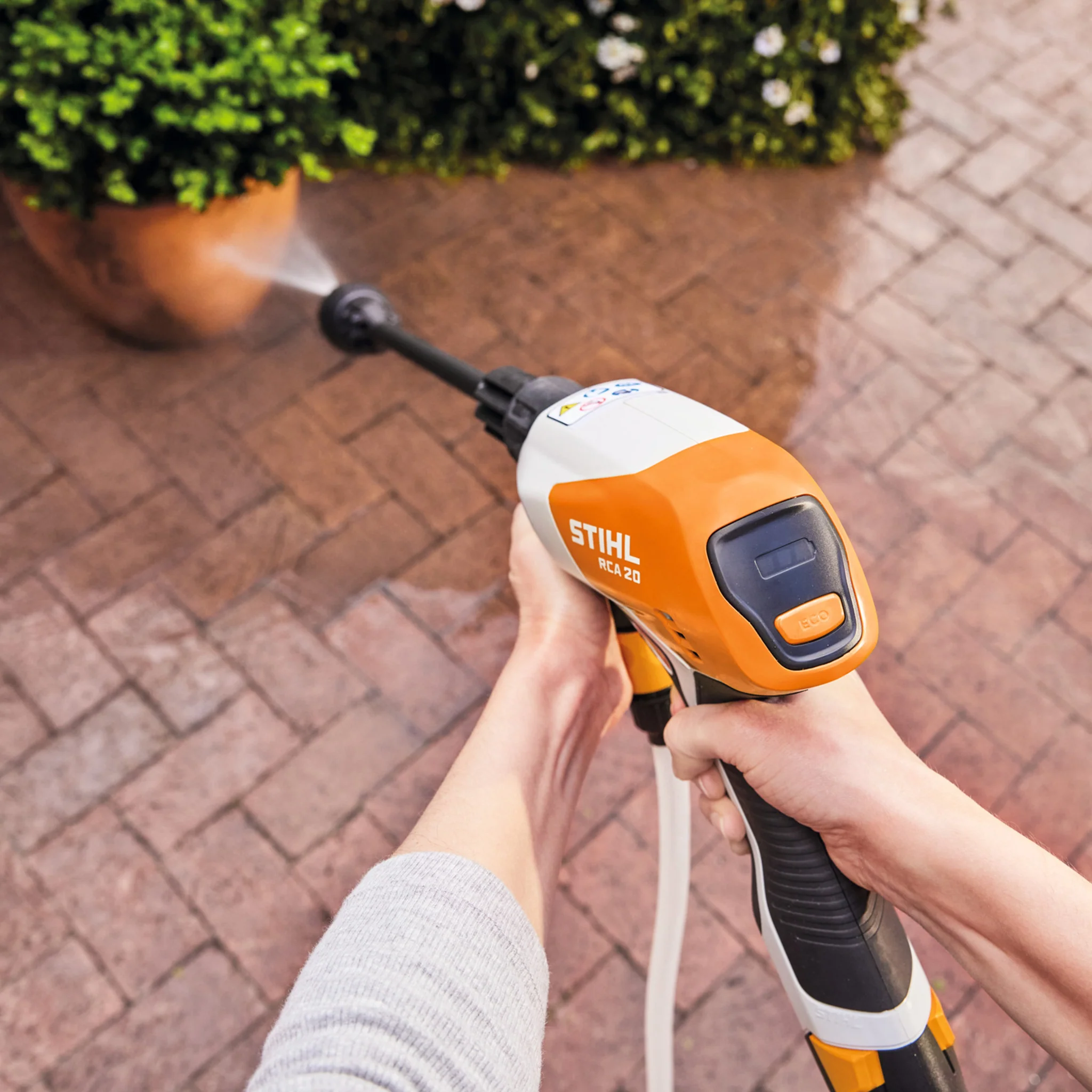 A maximum pressure of 24 bar and a low weight of only 1.5 kg means the RCA 20 is effortless to use and packs plenty of power for you to clean garden furniture, patios, barbeques, play equipment, car tyres or bikes. When less cleaning power is needed, you can use ECO mode which helps to extend the working time.