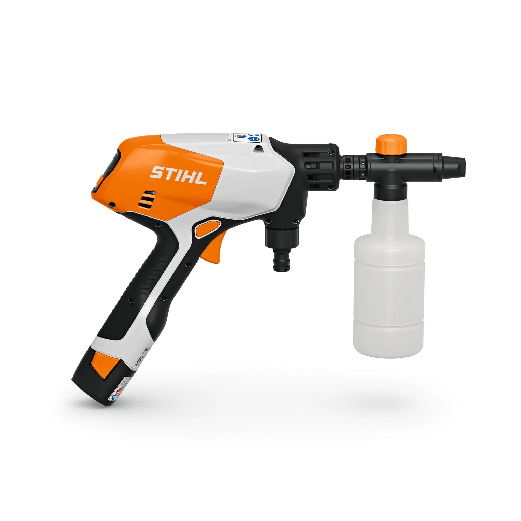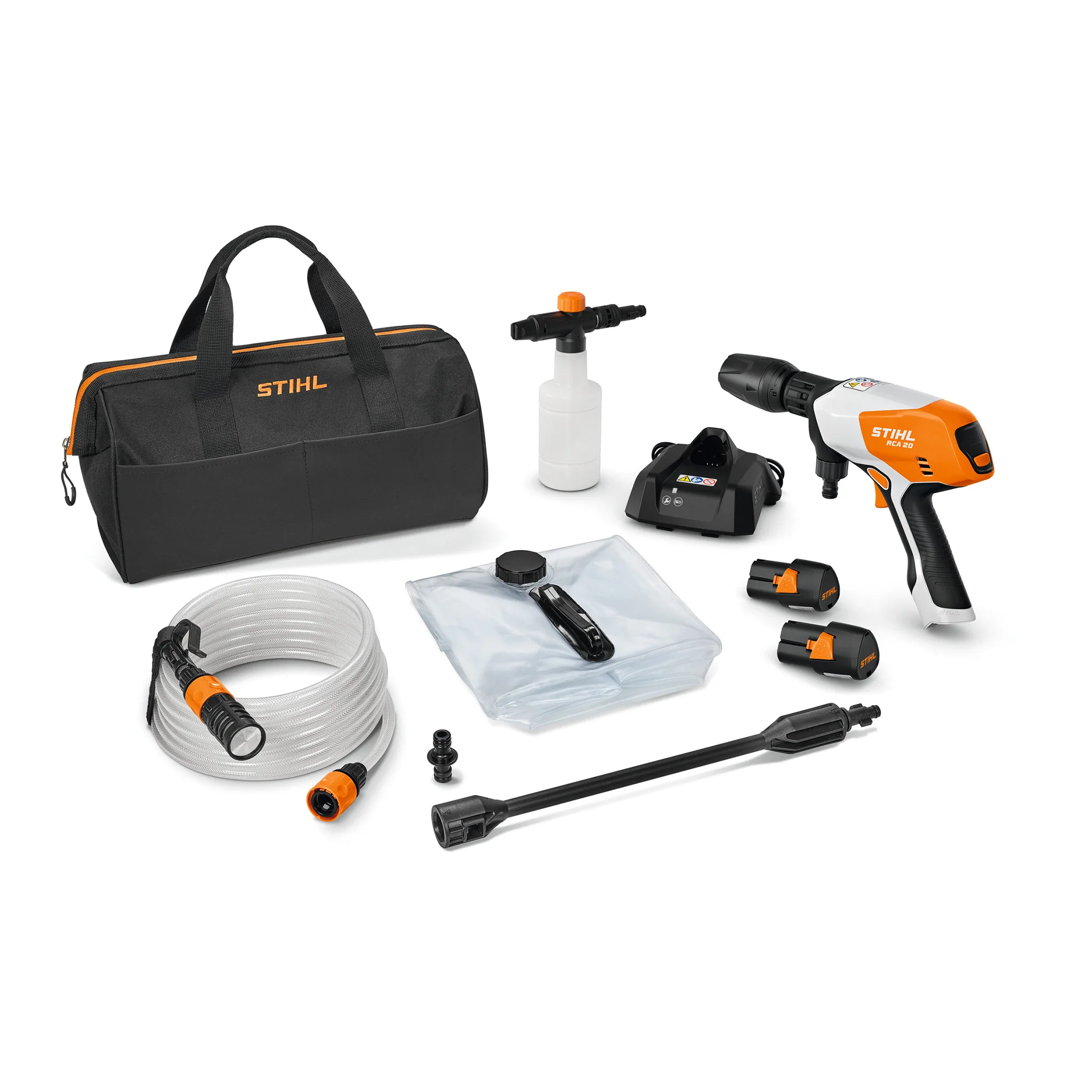 The RCA 20 is a portable pressure washer which you can use for small cleaning jobs at home or on the go. It is powered by an AS 2 battery, which means you don’t need a power connection to use this pressure washer – just plug-in the battery, connect to a water source and you can begin cleaning. And if a direct water connection isn’t available, you can even connect the RCA 20 to the 20-litre water container bag which comes as standard with the tool.