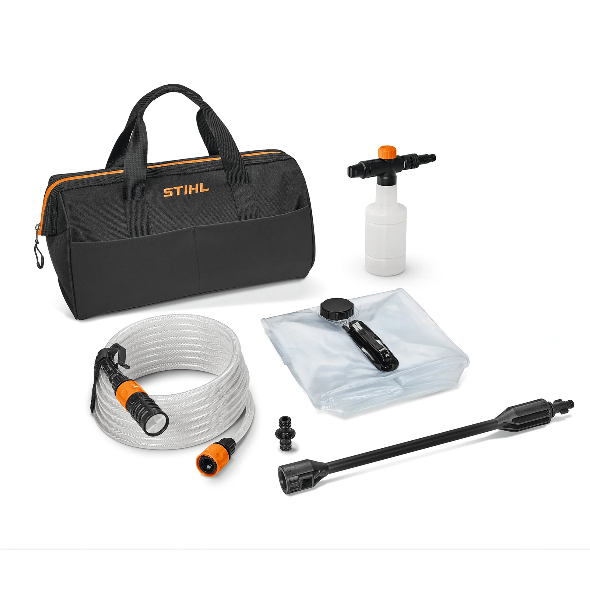 The RCA 20 comes with a variety of accessories, including the 4-in-1 multi nozzle which can be quickly changed between rotary, fan-jet, narrow jet and watering modes. It also comes with a spray lance extension, detergent spray set, 5 metre suction hose with filter and a 20 litre water container bag, which you can store away in the robust carry bag that comes with the pressure washer.
