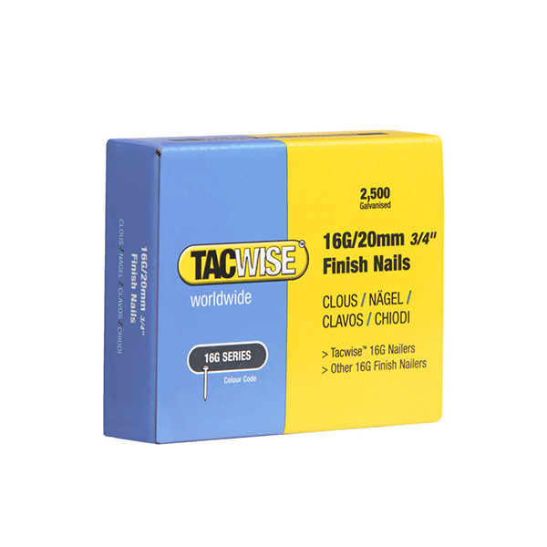 Pack of 2500 x type 16G / 20 mm galvanised steel finish nails, designed for high volume nailing jobs with Tacwise nail guns