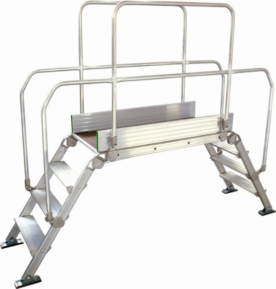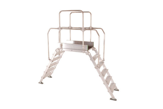 The Industrial Bridging Step utilises extra-large 150mm deep steps with handrails on both sides of the platform for maximum safety. Aluminium platform with timber Eurodeck non-slip surface. Ideal for use in factories and distribution centres for safe access over machines and conveyor systems.